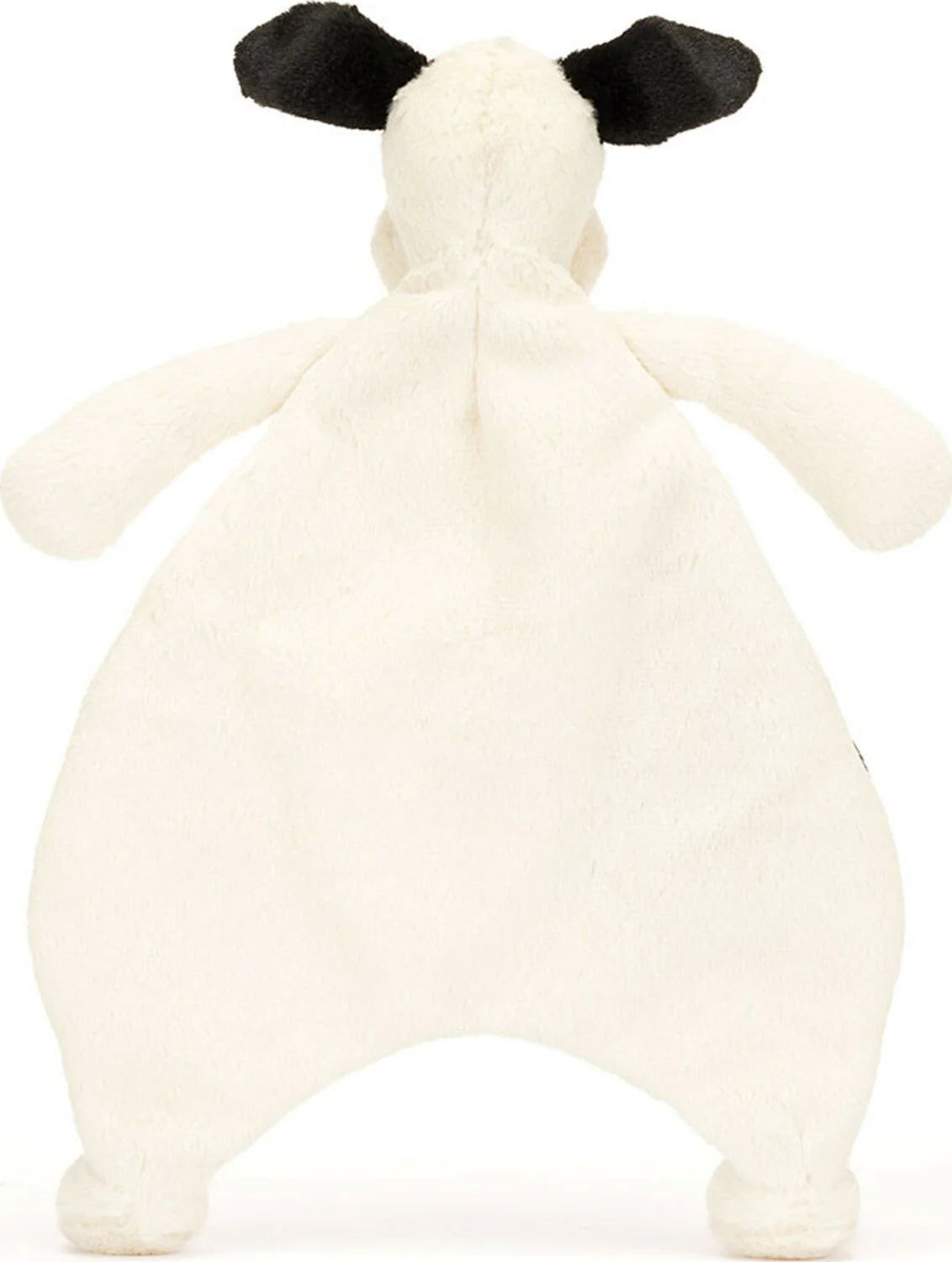 The Bashful Black & Cream Puppy Comforter is a portable patch of softness. This characterful puppy has been designed to comfort with squashy paws to hold onto and an un-stuffed tummy to hug. Made with soft cream fur of recycled fibres with adorable perky black ears, embroidered eyes and an oval squishy nose, Bashful Puppy will be a faithful friend for any newborn.